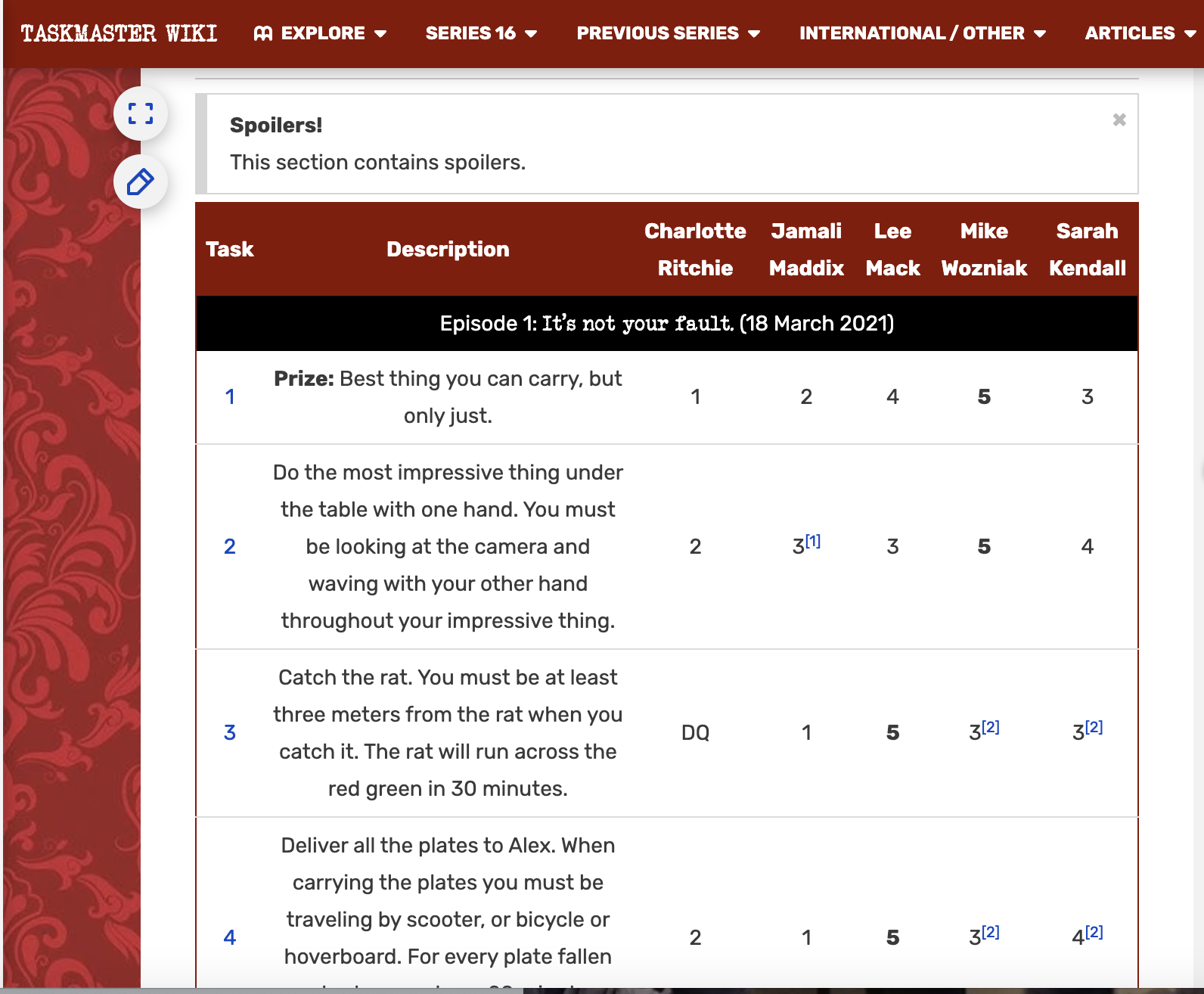 10 2 Do the most im… 1 "It's not y… 18 Marc… Sarah Ken… 4 11colnames: Task, Description, episode, episode_name, air_date, contestant, score, series